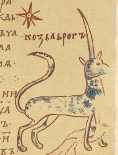 During certain periods of time in Russia, Capricorn was depicted as a Unicorn. In the Izbornik of Svyatoslav of 1073 - an ancient Russian handwritten book - there are images of the signs of the Zodiac, and Capricorn is written there as “goathorn” and it is there with just one horn. (Image 1)