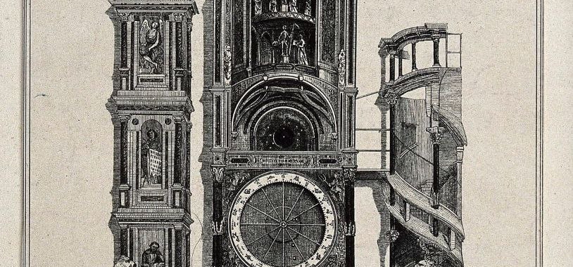 The clock features a planetary calendar, which shows the current positions of the sun and moon, and a mechanical rooster. Every day at 12:30 the rooster crows and apostles move around the clock.
